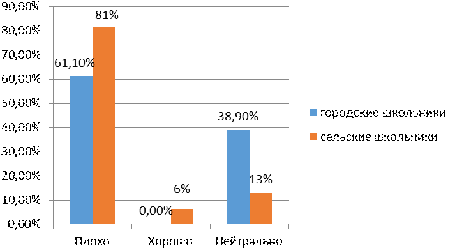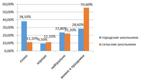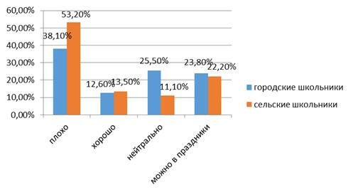 Из результатов опроса видим, что городские школьники, в основном, к алкоголю относятся плохо, т.к. считают, что алкоголь приводит к деградации личности, из-за алкоголя распадаются семьи, алкоголь приводит к многочисленным заболеваниям. Сельские же школьники к алкоголю относятся нейтрально и считают, что иногда можно в праздники выпить спиртные напитки и это ни к чему плохому не приведет.