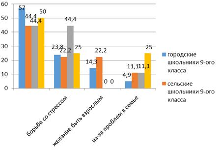 Анализируя данные диаграммы, можно отметить тот факт, что сельские школьники более лояльно относятся к курению, чем городские школьники.