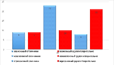 На основании анализа данных, представленных на рисунке 2.2, можно сделать следующие выводы: для данной группы военнослужащих, преобладающим стилем общения является компетентный способ - 23 человек, так же у 9 военнослужащих преобладает зависимый тип, у 8 военнослужащих преобладает агрессивный тип общения. Для группы военнослужащих выполняющие свои обязанности на "удовлетворительно", преобладающим способом общения является агрессивный способ общения 21 человек, так же у 9 военнослужащих преобладает зависимый тип, у 10 военнослужащих преобладает компетентный тип общения.