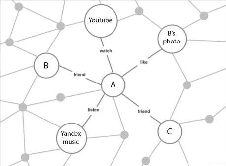На рисунке 1 показаны отношения между тремя индивидами. Индивид A имеет дружеские отношения с индивидами B и C. В свою очередь B и C не являются друзьями друг другу, но имеют общего друга A. Фото индивида В была оценена несколькими участниками сети, в том числе и пользователь А оценил его фото. Пользователь А слушает музыку на Яндекс Музыка и смотрит видео на YouTube.