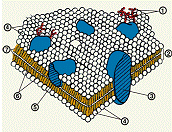 Интегральные белки, так же как и липиды, обладают свойством амфифильности: та часть белка, которая находится в мембране, состоит из гидрофобных аминокислот, скрученных в α-спираль; другая часть, выступающая из мембраны, - гидрофильных аминокислот. Интегральные белки удерживаются в мембране благодаря гидрофобным взаимодействиям. Но иногда их удерживают молекулы цитоскелета - микротрубочки и микрофиламенты. К концу интегрального белка, выступающего во внеклеточную среду, могут быть присоединены углеводы. Эти комплексы называются гликопротеинами. Они часто являются рецепторами, участвующими в иммунных реакциях. Примерами интегральных белков являются белок фоторецепторных мембран - бактериородопсин, пронизывающий мембрану семь раз, белок эритроцитов - гликофорин, к полипептидной цепи которых могут быть присоединены различные олигосахариды; эти гликопротеины определяют группу крови системы АВ0. Многие интегральные белки образуют каналы, через которые могут проходить водорастворимые молекулы и ионы. В этом случае внутренняя часть канала содержит гидрофильные радикалы аминокислот. Интегральные белки связаны с липидами прочными гидрофобными взаимодействиями.
