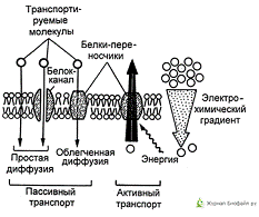 Если перенос вещества происходит с уменьшением электрохимического потенциала, то есть не требует затрат энергии, то такой транспорт называется пассивным. Его разновидностями являются диффузия (перемещение веществ в сторону меньшей концентрации) и фильтрация (просачивание веществ поры в сторону меньших значений давления). С помощью диффузии в клетку проникают растворенные молекулы кислорода и углекислого газа, а также яды и лекарственные препараты. Примером фильтрации в организме является перенос воды через стенки кровеносных сосудов, выдавливание плазмы крови в почечные канальцы.