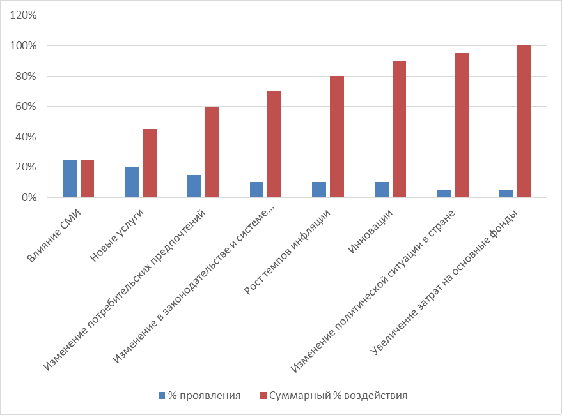 отсортируем % проявления факторов по убыванию, рассчитаем суммарный %