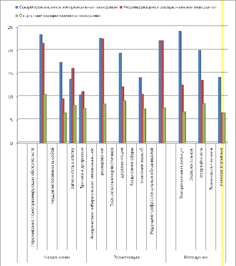 Рис. 2. Показатели методики “Диагностика эмоционального выгорания” В. В. Бойко медицинских сестёр с разным уровнем эмоционального выгорания