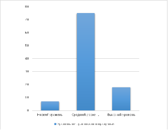 толерантности имеет 7% испытуемых (2 человека), средний - 75% (22 человека) и