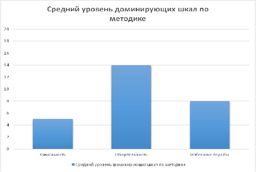 После проведения исследования были получены следующие результаты по методике «Q - сортировка». Исходя из полученных данных видно, что в группе преобладают следующие качества (зависимость 5 баллов, общительность 14 баллов, избегание борьбы 8 баллов), здесь можно говорить о том, что в выборке выявилось несколько тенденций.