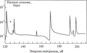 Рассмотрим сечение образования составного ядра в районе изолированных уровней, т.е. когда ширины уровней Г меньше расстояний между ними. Изолированные уровни составного ядра отчетливо проявляются при взаимодействии медленных нейтронов с ядрами (рис. 6). На этом рисунке показано полное сечение реакции n+232Th для нейтронов с энергиями 120-210 эВ. То, что наблюдаемые резонансы - уровни составного ядра, следует из их ширины.
