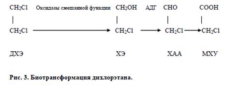 Первый этап биотрансформации ДХЭ - дехлорирование - происходит при участии неспецифической оксидазной системы микросом (оксидаз смешанной функции - ферментов из семейства гем-содержащих протеинов). В результате дехлорирования ДХЭ образуется хлорэтанол (ХЭ).