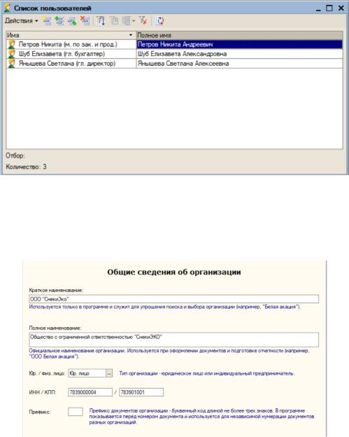 Для ведения бухгалтерского учёта в программе 1С составлен список пользователей, что показано на рисунке 1.