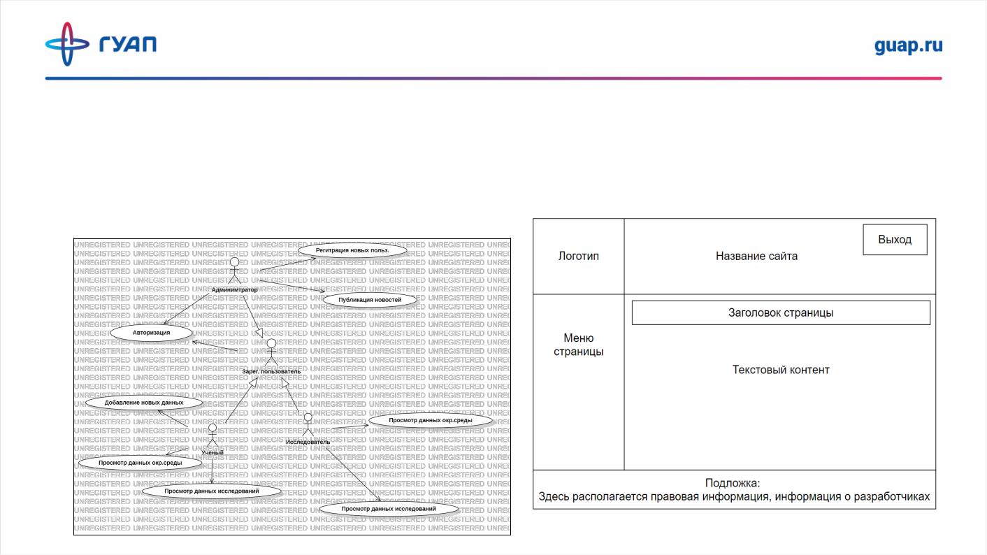 В представленной UML–диаграмме показаны категории зарегистрированных пользователей и их возможности в веб-приложении, так же представлен эскиз вебстраниц.