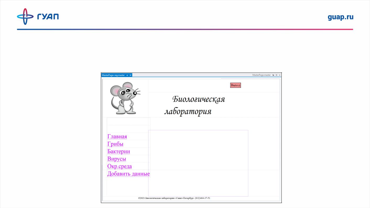 Создана эталонная страница с перечнем веб-страниц со ссылками на сами страницы, название, логотип лаборатории и кнопка выход, при нажатии которой будет открываться первоначальная форма входа.