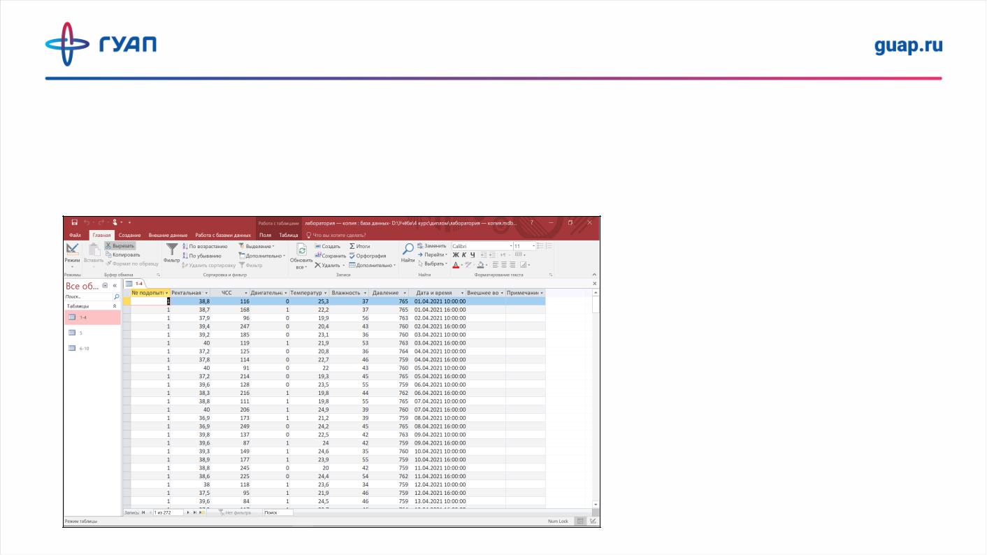 Данные Биологической лаборатории хранятся в БД Microsoft Access, на этом слайде представлена база данных и скриншот ее успешного подключения.