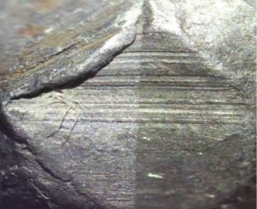 При микроскопическом исследовании представленных картечин установлено, что на их поверхностях имеются следы в виде полусферических вмятин, образовавшиеся от взаимодействия их друг с другом в период прохождения канала ствола. На картечинах № 3 и 5 имеются следы в виде притертости эллипсовидной формы, размером примерно 5,4×3,1 мм, характерные для контакта со стенками канала ствола оружия. В поле этих следов наблюдается микрорельеф, состоящий из разнонаправленных, прерывающихся трасс в виде валиков и бороздок в большинстве не параллельных друг другу и продольной оси движения картечин в канале ствола, с очевидными признаками сглаживания. При этом на картечине № 5 по краю следа эллипсовидной формы сохранились фрагменты микрорельефа в виде валиков и бороздок параллельных друг другу и продольной оси движения картечины в канале ствола (см. илл. 2), образующие в своей совокупности индивидуальный идентификационный комплекс признаков, пригодный для идентификации канала ствола оружия, его образовавшего. На картечине № 6 имеется фрагмент следа в виде притертости эллипсовидной формы (см. илл. 3), характерный для контакта со стенкой канала ствола оружия, в котором наблюдается микрорельеф, состоящий из трасс (валиков и бороздок), располагающихся параллельно друг другу и образующих в своей совокупности индивидуальный идентификационный комплекс признаков, пригодный для идентификации канала ствола оружия, его образовавшего.