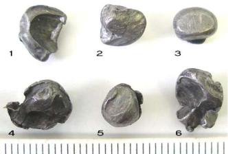 Все картечины из металла серого цвета (похожего на свинец), не притягивающегося к магниту. Для удобства описания и исследования картечины были условно пронумерованы от 1 до 6 (см. илл. 1).