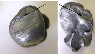 Илл. 2, 3. Картечины №№ 5, 6 со следами канала ствола. Расположение следов отмечено стрелками