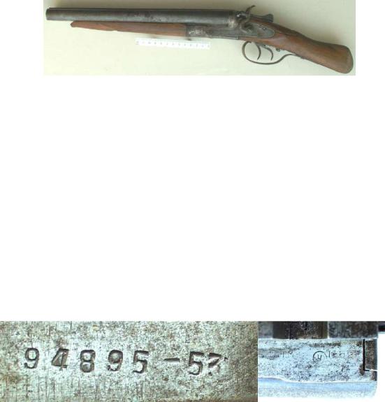 Представленный на исследование обрез ружья состоит из двух горизонтально расположенных стволов, колодки с внешним расположением курков и ложи с отъемным цевьем с защелкой рычажного типа, имеет общую длину 520 мм (см. илл. 4). Стволы отъемные, их запирание осуществляется на два подствольных крюка и поперечный болт. Длина стволов – 305 мм. Внутренний диаметр стволов: со стороны казенного среза (патронника) – 18,8 мм; со стороны дульного среза – 16,9 мм. Каналы стволов гладкие, стенки каналов стволов покрыты налетом темно-серого цвета, имеют многочисленные раковины. Ударные механизмы смонтированы на замочных досках. Шейка ложи полупистолетной формы. Приклад от ложи отпилен.