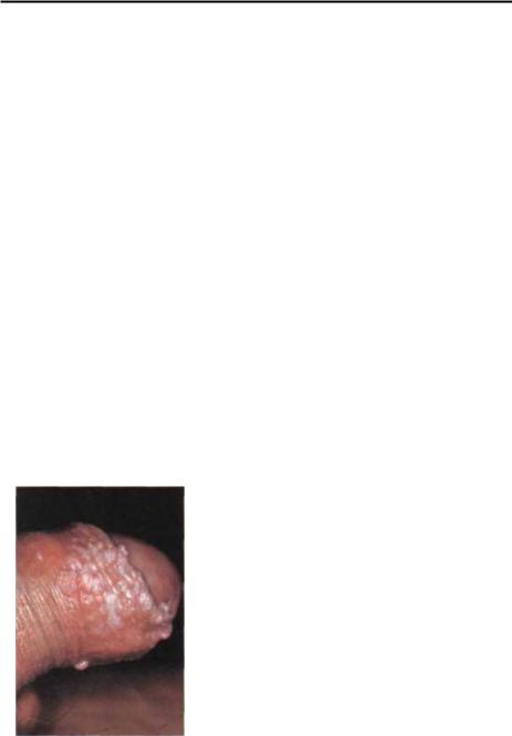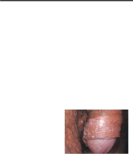 Рис.3-20: Вирусные моллюски систенции, гладкие, блестящие, крайней плоти полового члена. медленно увеличиваются в размере, достигая в среднем величины горошины. Поверхность элементов гладкая; в центре ее имеется пупковидное углубление, из которого при надавливании легко выделяется крошковатая масса беловатого цвета, состоящая из жира и моллюсковых телец. Обычно узелки располагаются небольшими группами или диссеминированно, иногда сливаясь в крупные неровные опухолеподобные образования ("гигантский моллюск"). Узелки малакоплакии в полости рта нередко можно спутать с базалиомой (Seifert Е. ссоавт.,1990).
