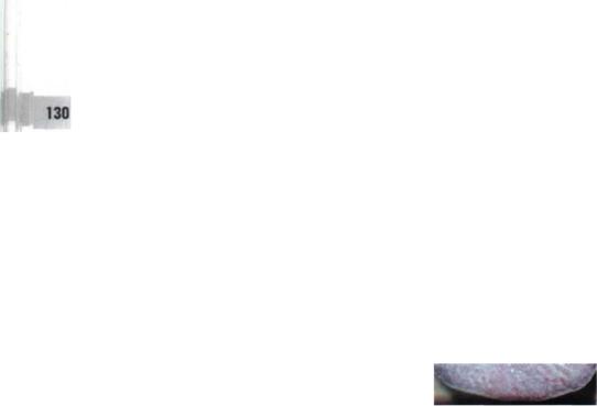 В развёрнутой стадии заболевания могут встречаться любые клинические варианты кандидоза. Наиболее характерная форма - острый псевдомембранозный кандидоз (рис.4-18), сопровождающийся белым, плотно спаянным с подлежащими тканями налётом. Налёт напоминает творожистые массы. Отдельные повреждения могут сливаться, образуя неправильной формы бляшкообразные чаши. Эти поражения напоминают гиперкератоз, лейкоплакию, элементы красного плоского лишая. При поскабливании налёта образуется