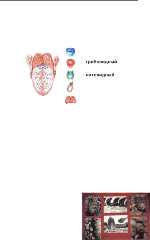 Рис. 1 -5: Микроскопическое строение сосочков языка (в гистологическом срезе и растровой электронной микроскопии).
