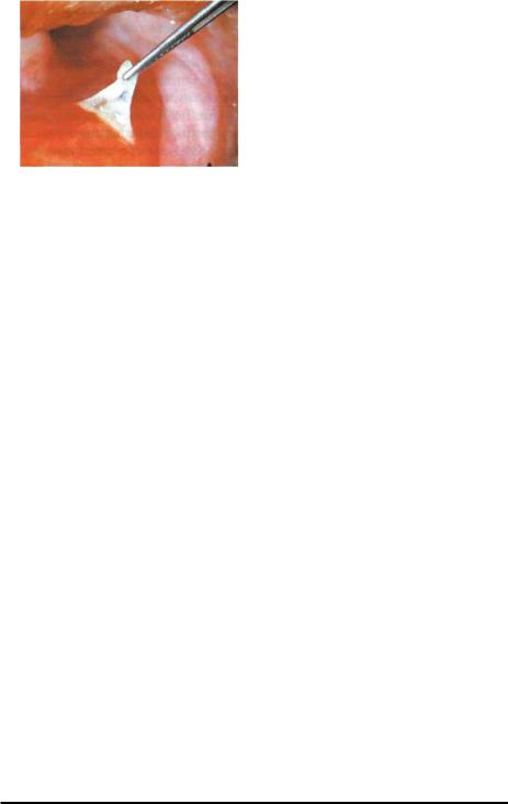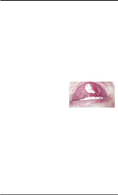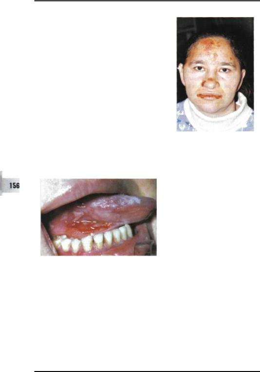 полагающиеся на любом её участке. Как правило, они локализуются на неиз менённом или эритематозном фоне и имеют серозное содержимое. По мере развития заболевания количество элементов нарастает (рис.6-1). Пузыри очень эфемерны, покрышка их тонкая, при мацерации и непрерывном давлении жид кости (внутри пузырей) они вскрываются, обнажая ярко-красные болезненные эрозии. Иногда (чаще всего) вместо пузырей образуются белые (сального цве та) плёнки, после отторжения которых возникают эрозивные поверхности. Эро зии часто "голые", без налёта и имеют ярко-красный цвет, спонтанно не крово точат, малоболезненны. Общее состояние больных часто удовлетворительное. Обычно в полости рта пузыри обнаруживаются редко и видны лишь эрозивные высыпания. По мере нарастания патологического процесса количество эрозий увеличивается, увеличиваются их размеры; при слиянии образуются очаги по ражения с фестончатыми краями. Наблюдают гиперсаливацию. В связи с выра женным болевым синдромом приём пищи затруднён. В случаях поражения гор тани и глотки голос становится хриплым. При наличии эрозий в углах рта, ретромолярной области у больных развивается "ложный " тризм (А.Л. Машкил-