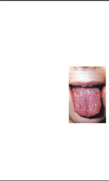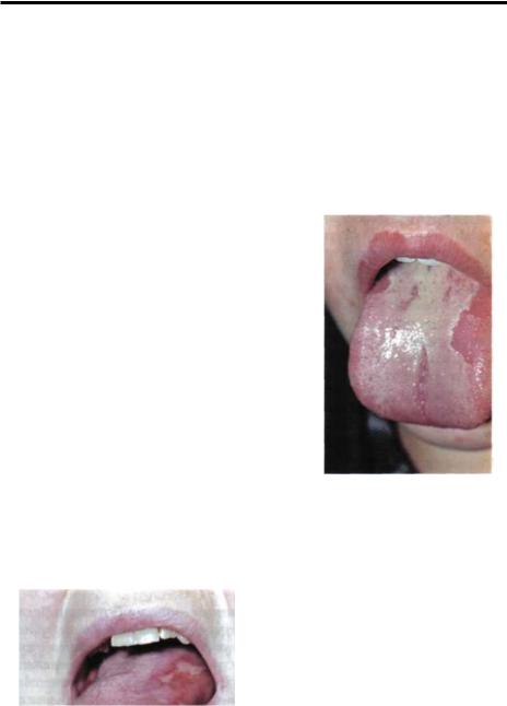 языка. Почти всегда возникает чувство жжения, поверхность языка ярко-крас- ная, блестящая.