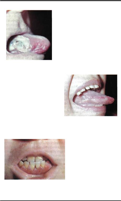 Необходимо отметить, что из-за резкого снижения сопротивляемости организма при лейкозах, в полости рта нередко развивается кандидоз. По данным ряда авторов, грибковые поражения полости рта обнаружены у25% больных острым лейкозом и развиваются вследствие специфического лейкемического процесса и действия лекарств(антибиотики, цитостатики, кортикостероиды). Ряд авторов (А.И.Саградян, 1964; Lannigan, Meynell, 1959) описывают гранулематозную форму кандидоза у нелечённых больных, задолго до появления специфических симптомов. Течение грибкового стоматита и глоссита характеризовалось рядом особенностей. Нередко отсутствовала стадия катарального воспаления, которая обычно предшествует появлению налётов. На фоне бледной слизистой оболочки ротовой полости обнаруживались мелкоточечные или пышные хлопья налёта, который снимался с некотором усилием, обнажая слегка мацерированную слизистую оболочку. На языке развиваются желтоватые, плоские, плотные, слегка приподнятые на узком основании бляшки неправильной формы, расположенные на умеренно инфильтрированной слизистой оболочке, 1 -5 мм в диаметре. Патологоанатомические исследования показали, что эти грибовидные образования представляют собой участок выраженного гиперкератоза эпителия сосочков языка, пронизанный эпителием гриба. В некоторых случаях дрожжевому стоматиту предшествовали или сопутствовали дрожжевые поражения губ и углов рта. Изолированный кандидозный глоссит в виде "волосатого языка" или в виде появления типичного налёта на дорсальной и нижнебоковых поверхностях языка обнаружен у7% больных.