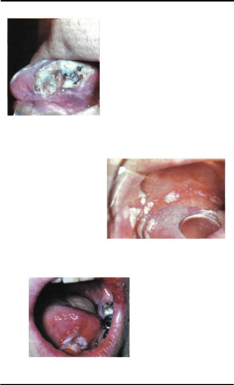 При острых лейкозах в55% случаев наблюдается язвенно-некротический характер поражения слизистой оболочки полости рта(Ф.Х.Хаваш, 1965), особенно в области мягкого нёба, спинки и кончика языка. Гистологически определяются многочисленные некрозы слизистой оболочки, проникающие в подслизистый, а нередко и в мышечный слой.