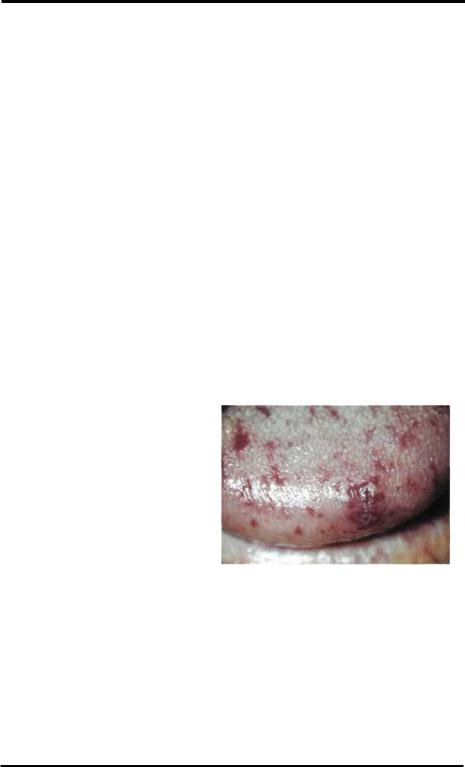спонтанно. Наиболее часто экхимозы развиваются на коже передней поверхности туловища и конечностях, реже - на слизистой оболочке рта. В отличие от гемофилии, кровоизлияний в суставы не бывает. Нередко кровоизлияния возникают в местах инъекций. Профузные кровотечения нередко приводят к анемии. Опасные кровотечения связаны с оперативными вмешательствами в полости рта (удаление зуба, тонзиллэктомия). При повторных длительных кровотечениях развивается железодефицитная анемия. Постоянным признаком тромбоцитопенической пурпуры является симптом"щипка" (на месте щипка появляется подкожное кровоизлияние, увеличивающееся в течение нескольких часов). В полости рта отмечается сухость слизистой, нитевидные сосочки языка в отдельных участках атрофированы. В зонах атрофии чётко определяются петехии.