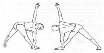 Техника выполнения: И. п.: тадасана. Расставьте стопы на расстояние приблизительно в метр. Руки поднимите в стороны и зафиксируйте на уровне плеч, ладони поверните вниз. Правую стопу поверните вправо на 90 градусов. Левую стопу поверните вправо на 60 градусов, левую ногу держите вытянутой и напряженной в колене. Сделайте выдох. Поверните направо туловище, левое бедро и колено. Опустите левую ладонь на пол или на кирпич за правой стопой. Вытяните вверх правую руку. Посмотрите на большой палец правой руки. (Правая и левая рука должны быть на одной линии). Подтяните коленные чашечки. Зафиксируйте колени. Следите за пальцами правой стопы, они не должны отрываться от пола. Следите за наружной частью левой стопы, она должна полностью располагаться на полу. Вытяните плечи и лопатки. Оставайтесь в париврите триконасане 30 секунд. Дышите нормально. Сделайте вдох. Поднимите левую руку от пола или кирпича, поверните туловище и вернитесь в исходную позицию. Сделайте выдох. Повторите позу в левую сторону. Выполняйте паривриту триконасану в обе стороны равное количество времени.