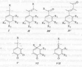 Найсуттєвіший вплив на поглинання світла лігніном мають сполучені з ароматичним ядром карбонільні групи і подвійні зв’язки бічного пропанового ланцюга (структури типу І, II, III, IV). Ауксохромний ефект підсилюється фенольними гідроксилами, які є в нативному лігніні, а також хромогенними групами вторинного походження типу о-хінону (V), семихінону (VI), хінонметиду (VII). Хіноїдні структури можуть утворюватися в лігніні під час нагрівання, а також внаслідок дії хімічних реагентів, особливо лугів.
