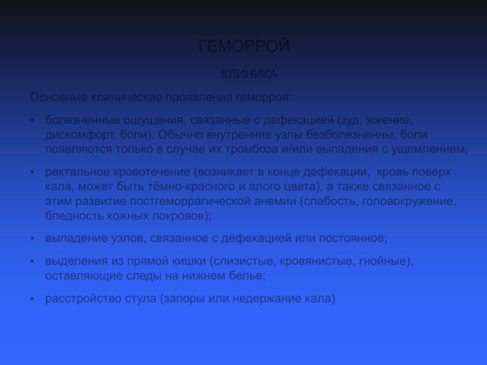 •ректальное кровотечение (возникает в конце дефекации, кровь поверх кала, может быть тёмно-красного и алого цвета), а также связанное с этим развитие постгеморрагической анемии (слабость, головокружение, бледность кожных покровов);