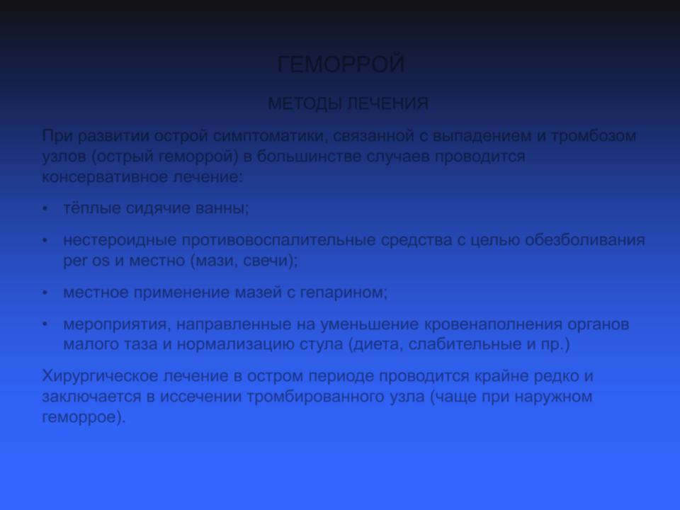 При развитии острой симптоматики, связанной с выпадением и тромбозом узлов (острый геморрой) в большинстве случаев проводится консервативное лечение: