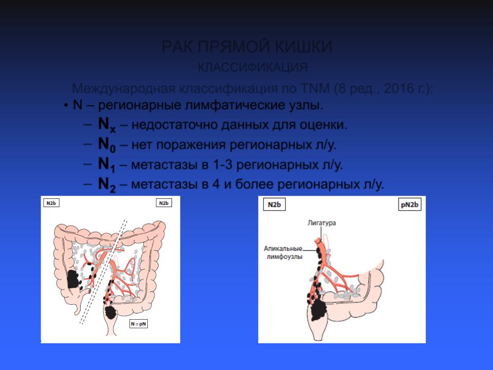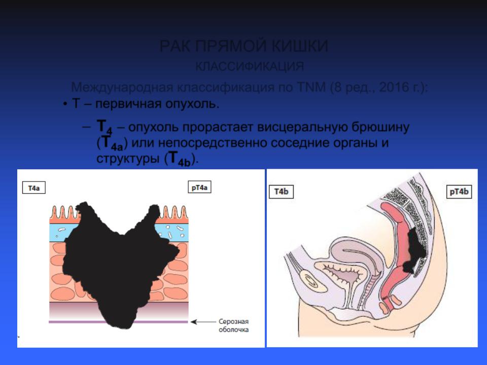 Т4 – опухоль прорастает висцеральную брюшину (Т4a) или непосредственно соседние органы и структуры (Т4b).