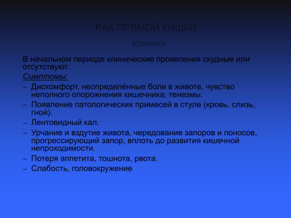 Дискомфорт, неопределённые боли в животе, чувство неполного опорожнения кишечника, тенезмы.