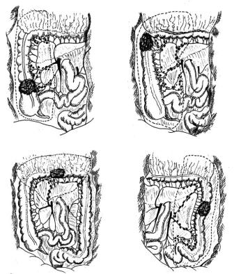 Рис. 72. Объем операции при раке слепой и восходящей (а), правого изгиба (б), средней трети поперечной (в), левой трети поперечной, левого изгиба и нисходящей (г) ободочной кишки