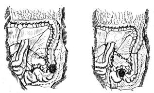 При расположении опухоли в слепой и восходящей толстой кишке удаляют всю правую половину толстой кишки с частью терминального отдела подвздошной кишки - право-