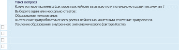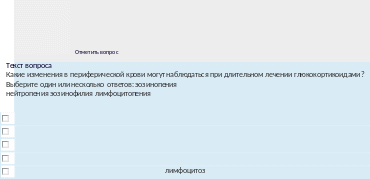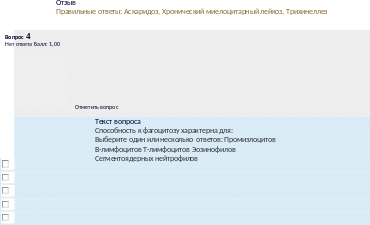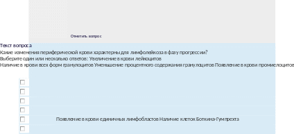 Текствопроса Укажитехарактерныеизмененияпериферическойкровиприхроническомлимфолейкозе: Выберитеодинилинесколькоответов:НаличиеклетокБоткина-Гумпрехта НаличиенейтрофиловстоксигеннойзернистостьюНейтропения Анемия Абсолютныйлимфоцитоз Наличиенеменее4O%лимфобластовНейтрофилия |
