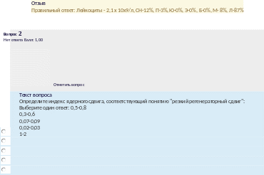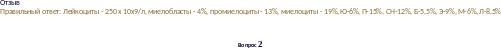 Отзыв Правильный ответ: Лейкоциты - 10 х 10х9/л, СН-52%, Ю-0%, П-8%, Э-23%, Б-1%, М-4%,Л-12% |