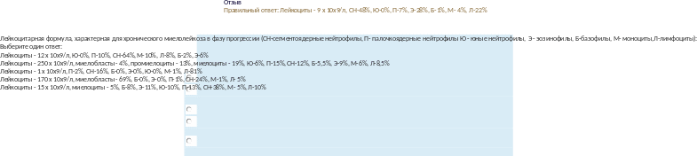 Лейкоциты - 3,8 х 10х9/л, СН-24%, П-18%, Ю-0%, Э -0%, Б-0%, М-2%, Л-56%Лейкоциты - 10 х 10х9/л, СН-52%, Ю-0%, П-8%, Э-23%, Б-1%, М- 4%, Л-12%Лейкоциты - 1 х 10х9/л, СН-4%, П-6%, Ю-0%, Э-0%, Б-0%, М-1%, Л-89%Лейкоциты-16х10х9/л,СН-73%,П-11%,Ю-6%,Э-0%,Б-0%,М-4%,Л-6%