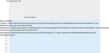 Текствопроса Укажитехарактерныеизмененияпериферическойкровиприхроническоммиелолейкозе: Выберитеодинилинесколькоответов: Лейкемические'зияние'Лимфоцитопения АнемияНейтропения Эозинофильно-базофильнаяассоциацияЛимфоцитоз Появлениевпериферическойкровивсехпромежуточныхформлейкоцитов |