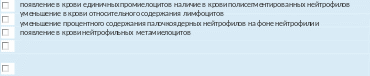 Правильныеответы:уменьшениепроцентногосодержаниянейтрофилов,появлениевкровипролимфоцитов,появлениевмазкекровитенейБоткина-Гумпрехта,анемия