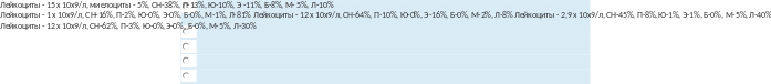 Лейкоциты - 1 х 10х9/л, СН-4%, Ю-0%, П-6%, Э-0%, Б-0%, М- 1%, Л-89%Лейкоциты - 18 х 10х9/л, СН-16%, П-6%, Ю-1%, Э-1%, Б-0%, М-14%,Л-62%Лейкоциты-16 х10х9/л,СН-73%, П-11%,Ю-6%,Э-0%,Б-0%,М-4%,Л-6%