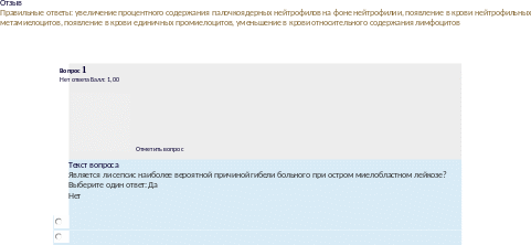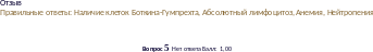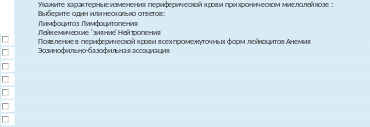 Отзыв Правильныеответы:Появлениевпериферическойкровивсехпромежуточныхформлейкоцитов,Эозинофильно-базофильнаяассоциация,Лимфоцитопения,Анемия |