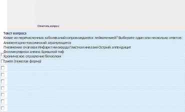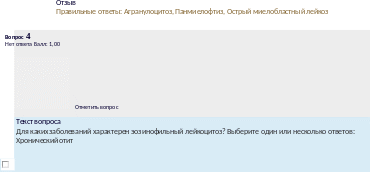Текствопроса Определитенарушениявсистемекрови,прикоторыхвозникаетбеззащитностькинфекции Выберитеодинилинесколькоответов:Агранулоцитоз ОстрыймиелобластныйлейкозНейтрофильный лейкоцитозПанмиелофтиз Лимфоцитоз ЭозинофильныйлейкоцитозЭритремия |