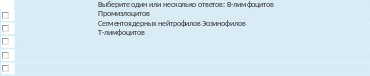 Текствопроса Укажитехарактерныеизмененияпериферическойкровиприхроническомлимфолейкозе: Выберитеодинилинесколькоответов:Нейтропения НаличиеклетокБоткина-ГумпрехтаАбсолютныйлимфоцитоз НейтрофилияАнемия Наличиенейтрофиловстоксигеннойзернистостью Наличиенеменее4O%лимфобластов |
