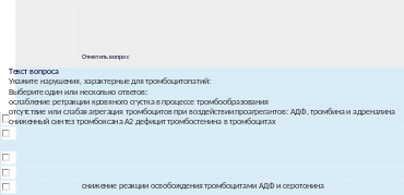 Текствопроса Укажитефакторы,действиекоторыхвызываетадгезиюиагрегациютромбоцитов:Выберитеодинилинесколькоответов: повышениевкровиконцентрацииАДФ повреждениеэндотелия освобождениеизбыткатканевоготромбопластинаизбытокцАМФв крови |