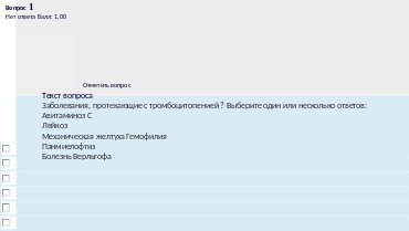 Текствопроса Болезни,прикоторыхнаблюдаетсятромбоцитоастения?Выберитеодинили несколько ответов: Геморрагическаятромбоцитодистрофия Болезнь ГланцманаБолезньВерльгофаПанмиелофтиз Лейкоз |