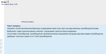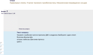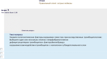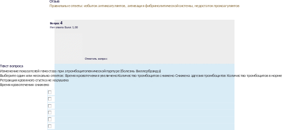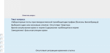 Правильные ответы: дефицит рецепторов тромбоцитов к фактору Виллебранда,нарушениевзаимодействиятромбоцитовсколлагеномсубэндотелиальногослоя