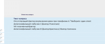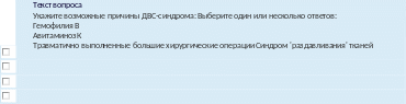 Текствопроса ПричиныКоагулопатииПфазы: Выберитеодинилинесколькоответов:Гемофилия Авитаминоз КЦиррозпечени ГемофилоидныесостоянияАфибриногенемия Обтурационнаяжелтуха |