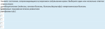 Текствопроса Укажитепатологическиесостоянияиболезни,сочетающиеся,какправило,сгиперкоагуляцией: Выберитеодинилинесколькоответов:тромбоцитозы авитаминоз Kгиполипидемия эритремия |